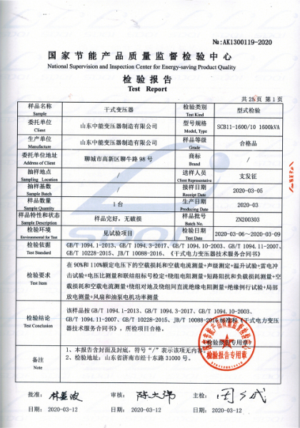 國(guó)家節(jié)能產(chǎn)品質(zhì)量監(jiān)督檢驗(yàn)中心 查詢(xún)編號(hào):AK1300119 查詢(xún)備案證書(shū)號(hào):GJJN-B-K2000120 批準(zhǔn)日前:2020-03-12 公司名稱(chēng):山東中能變壓器制造有限公司