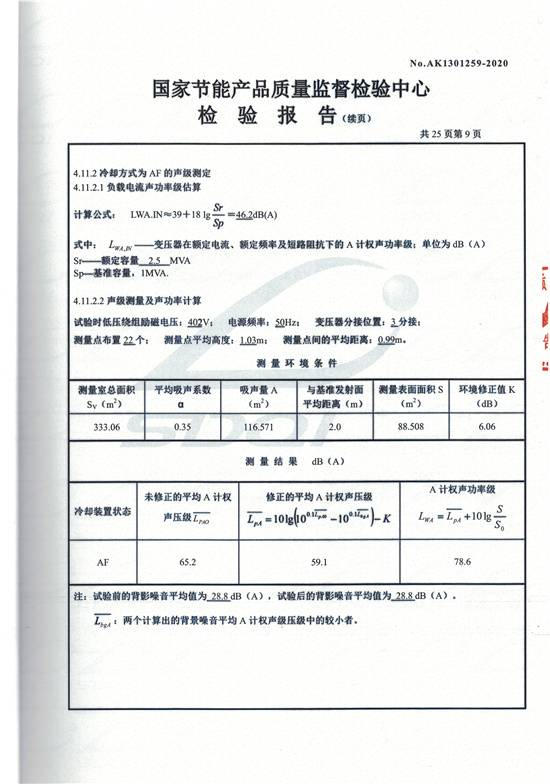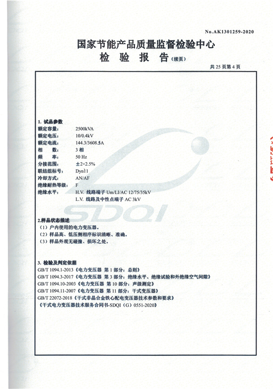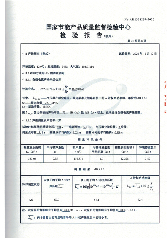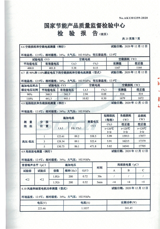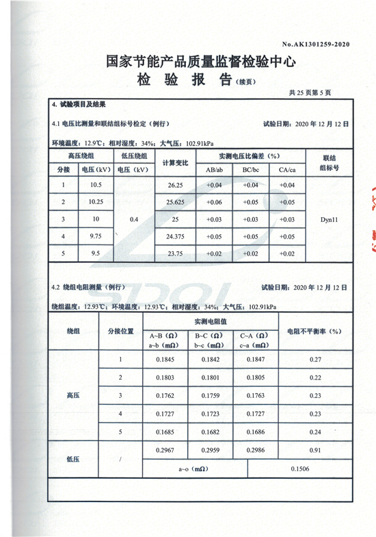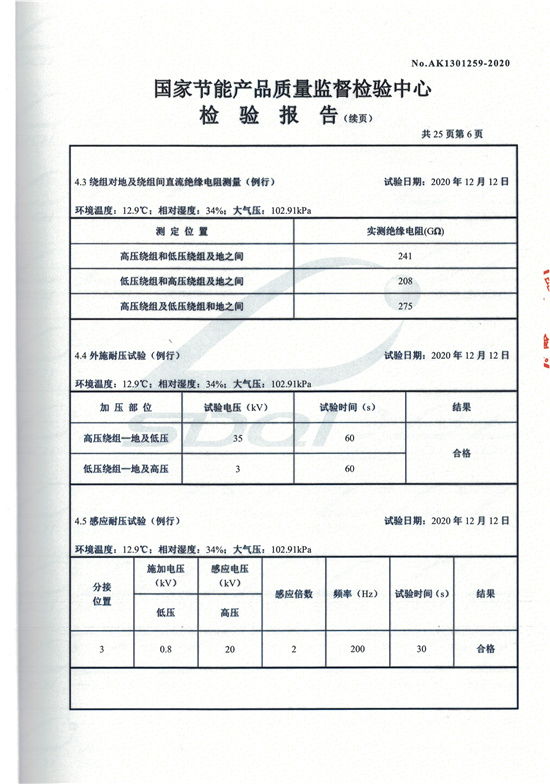 SCBH15非晶合金干式變壓器檢驗報告